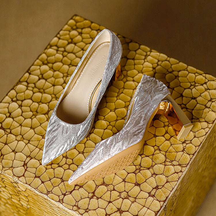 Graceful curves and soft shimmer highlight these pointed pumps, detailed with a textured, wavy pattern, balanced on a metallic block heel for sleek evening wear and understated bridal elegance.