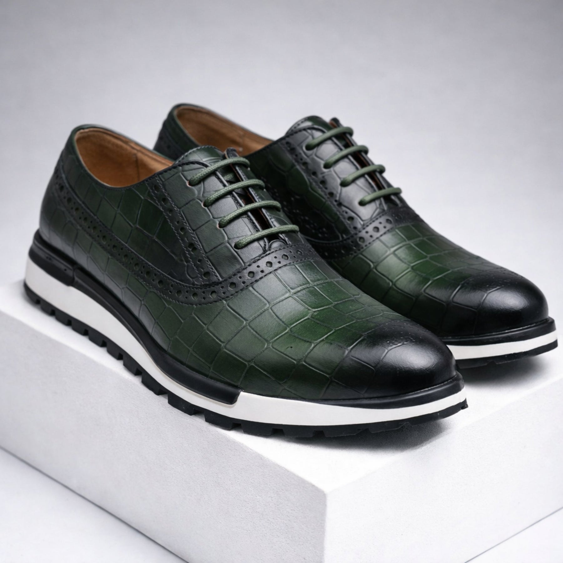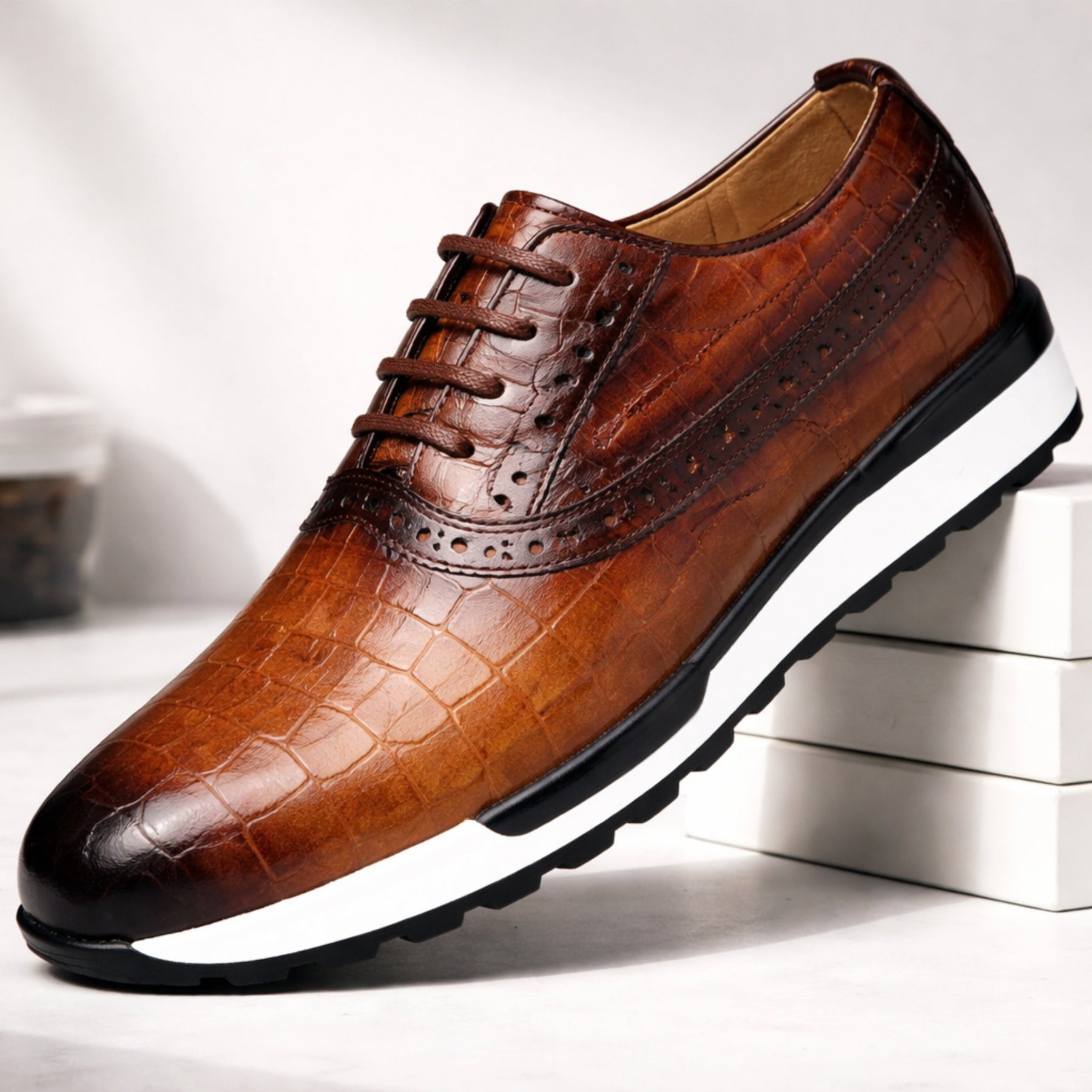 Croc-embossed genuine leather enhances the burnished profile of these shoes, crafted with subtle brogue detailing and a sleek, grippy rubber outsole for classic everyday styling.