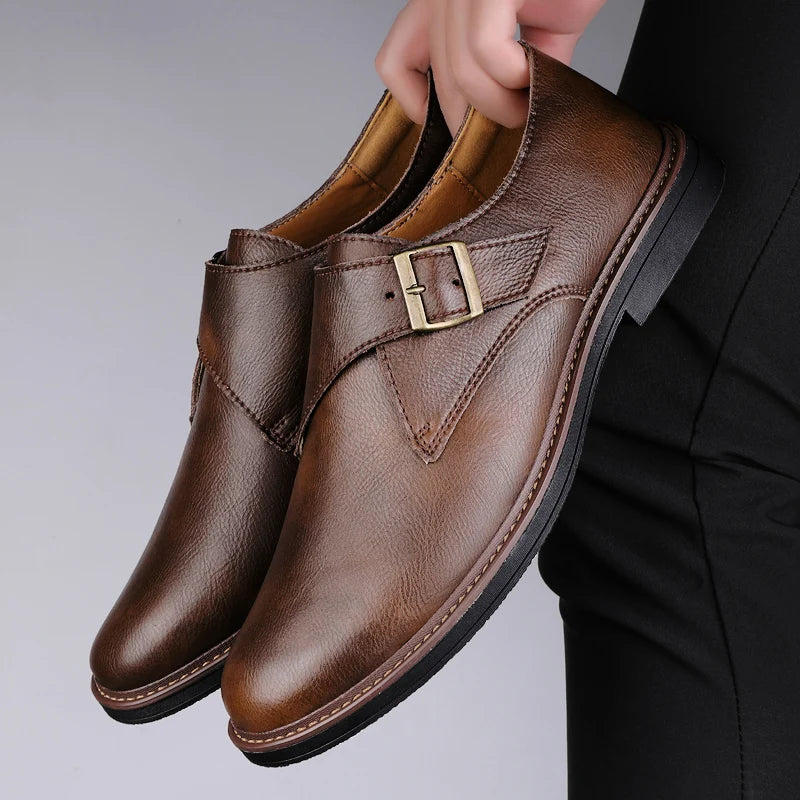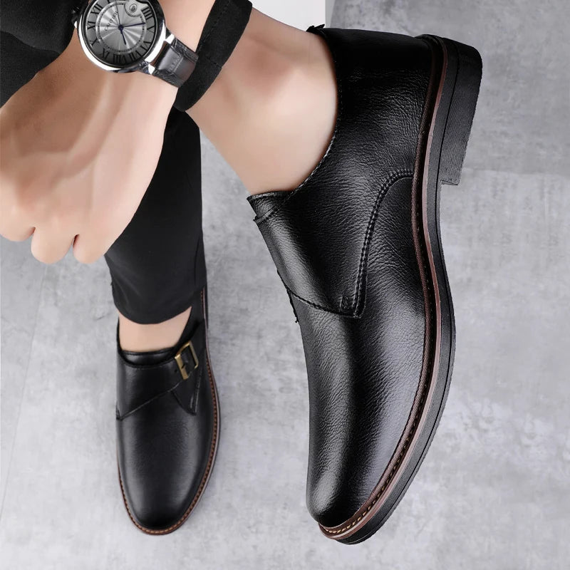 A streamlined single-buckle profile brings a refined silhouette to this shoe, cut from textured genuine leather with a smartly squared toe, designed for casual and dressy days.
