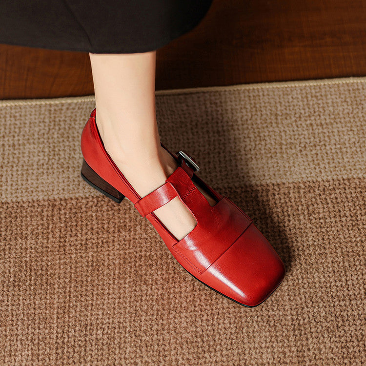 A classic T-strap design shapes these genuine leather pumps, featuring a buckle-fastened instep strap and a square-toe silhouette, set on a stable block heel with cushioned comfort.