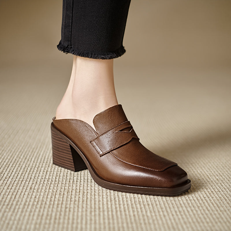 Inspired by Western silhouettes, these classic genuine leather mules pair a modern square-toe with a sleek penny strap and a comfortable block heel, perfect for elevating any outfit.