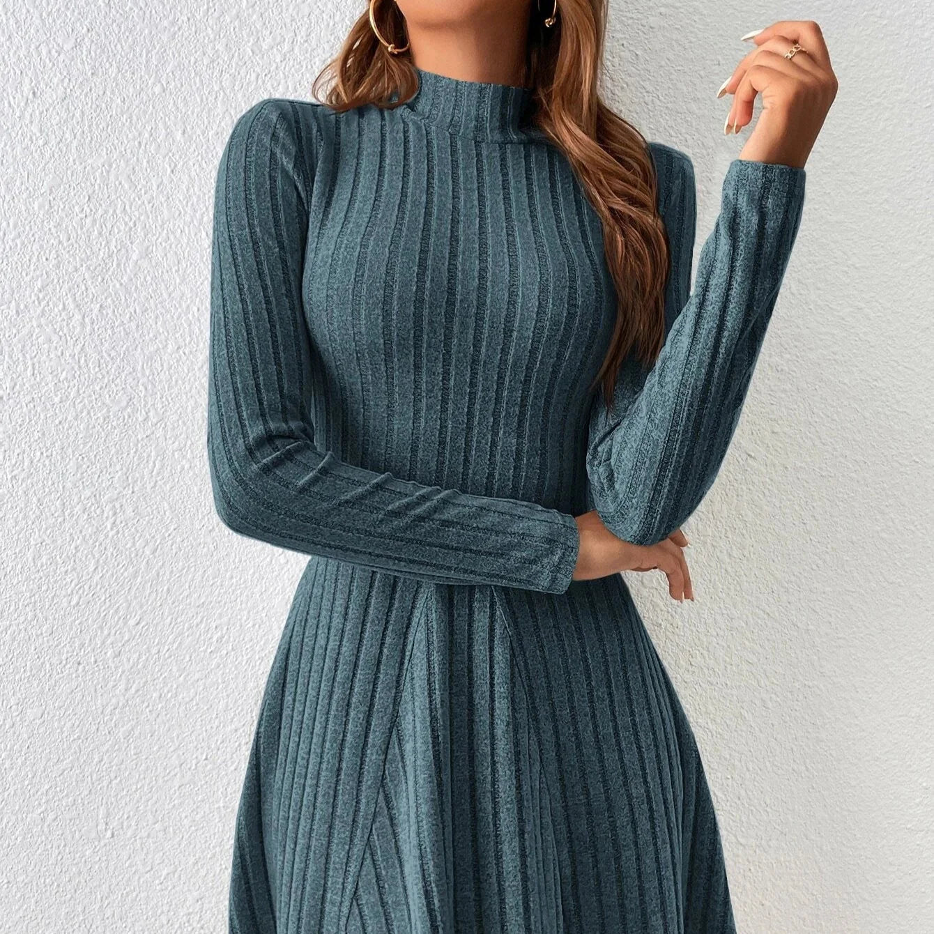 With ribbed texture and flared hem, this dress blends a high-waisted fit and a refined mock neck while its soft, stretchable fabric ensures cozy elegance for any season.