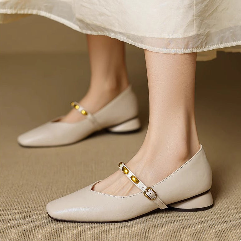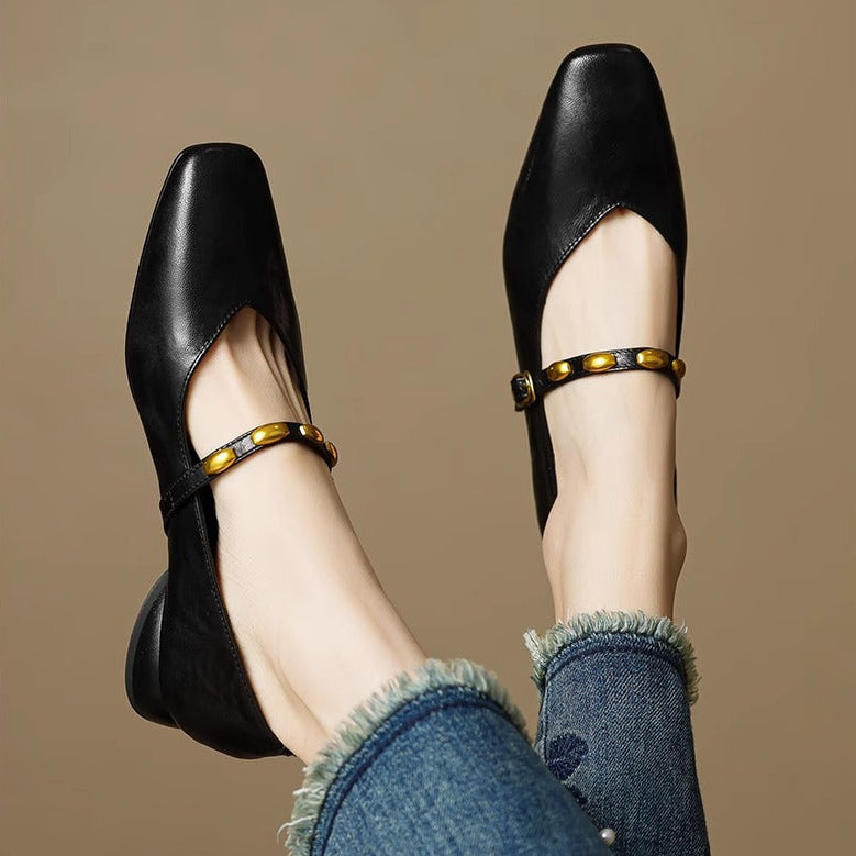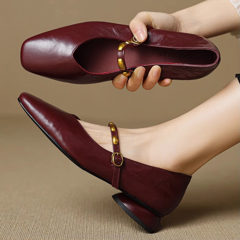 Romantic charm defines these genuine leather mary jane flats, combining a square toe and low block heel with a strap secured by a gold-tone buckle.